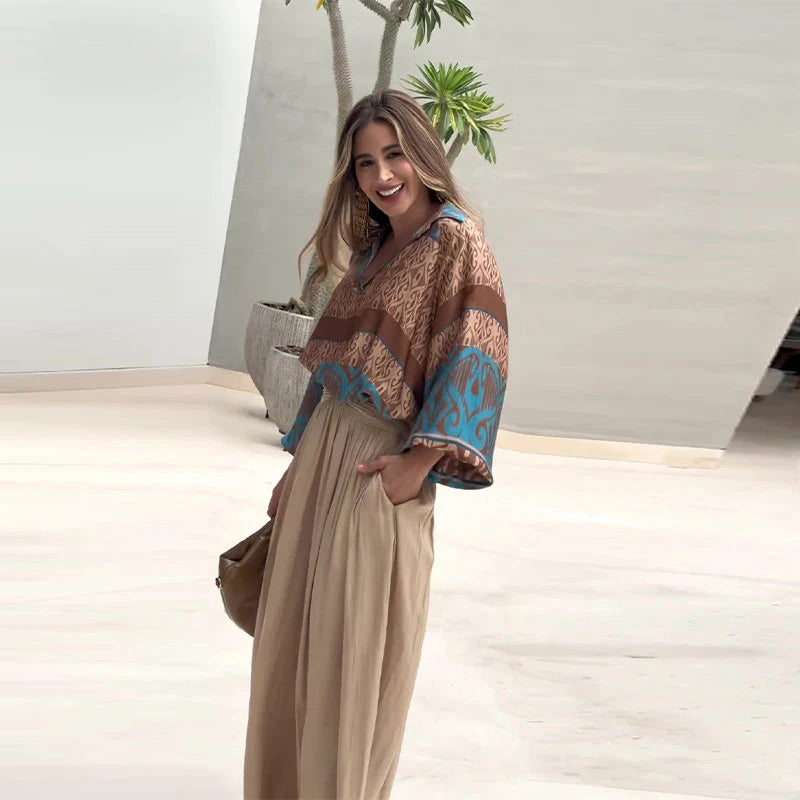 Experience the perfect combination of comfort and style with this Printed Top & Wide Leg Pants 2-Piece Set. Enhance your elegance with a loose fit, high-waisted pants, detailed long-sleeved top, and versatile elegance for any occasion.